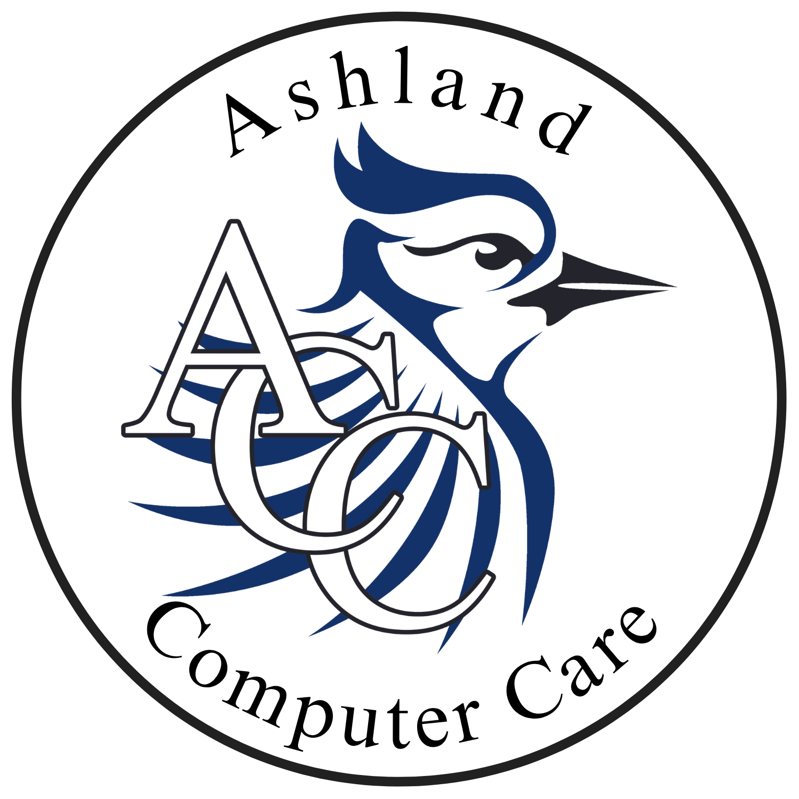 This is my current logo. The bluejay is our small town mascot. I would like to incorporate tech into the logo somehow. I also need to add my phone number. I need this to be a simple two color logo for marketing purposes. Simple, yet classy. Please help me.