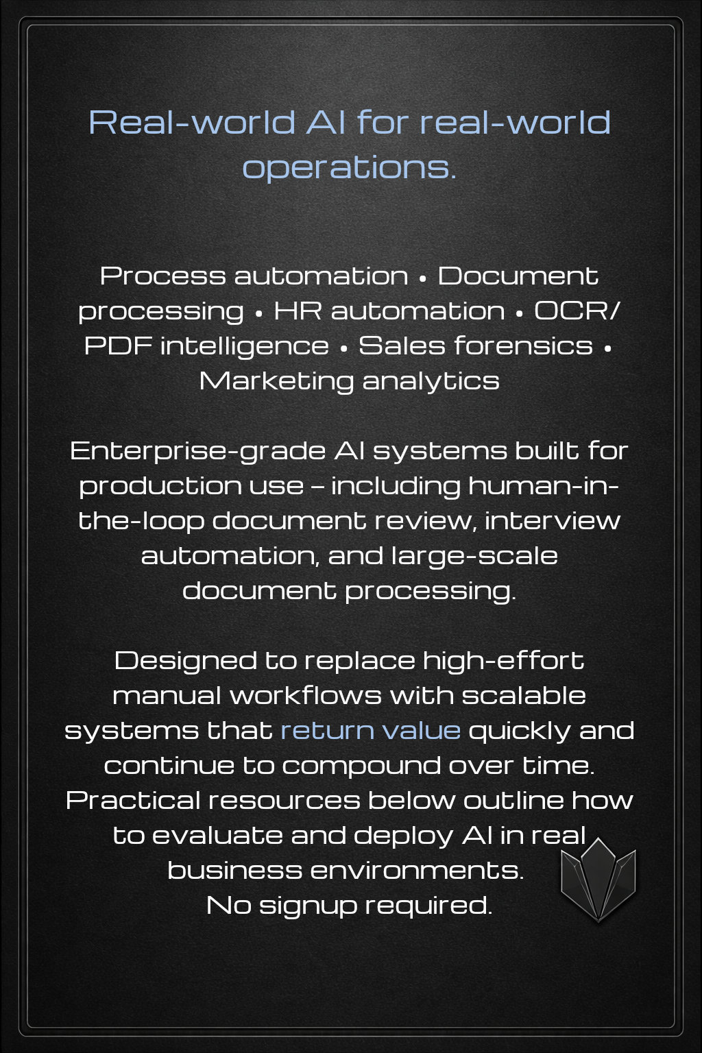 This work focuses on deploying AI as an operational capability, not an experiment. Systems are designed to replace high-effort manual processes with controlled automation, combining deterministic logic, human review, and narrowly scoped AI where it delivers the most leverage.