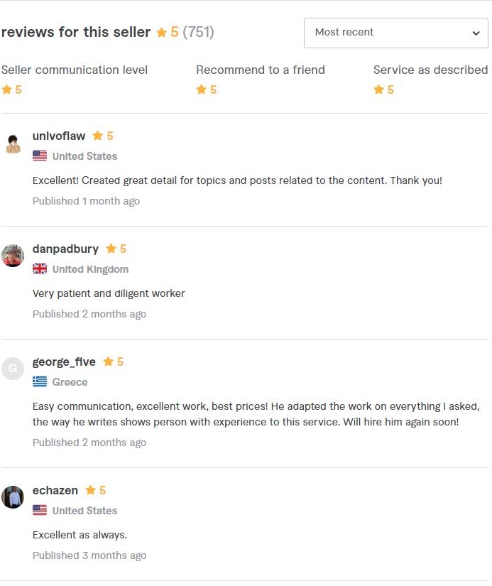You can expect high quality content, written by me and only me. I do not copy-paste content from other sites nor do I use ChatGPT or other generative AI to do my work for me. I am a native English speaker. You can rest assured that I will make quality and unique content for your site or forum.