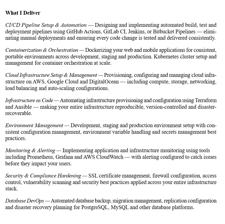How I Work: Every DevOps engagement begins with a thorough audit of your current infrastructure, deployment workflows and development processes — identifying gaps, risks and automation opportunities before recommending solutions. I leverage AI-assisted tools throughout the engagement, combining 27 years of IT industry experience with modern DevOps practices to deliver faster, more reliable infrastructure outcomes.
