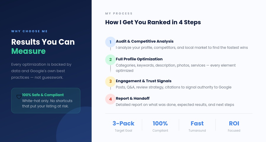 I don't use shortcuts or black-hat tactics that risk your listing. Every optimization I do follows Google's guidelines, so your rankings are built to last. Whether you're a local shop, a service-area business, or a multi-location brand, I tailor the strategy to your specific market and competition level.