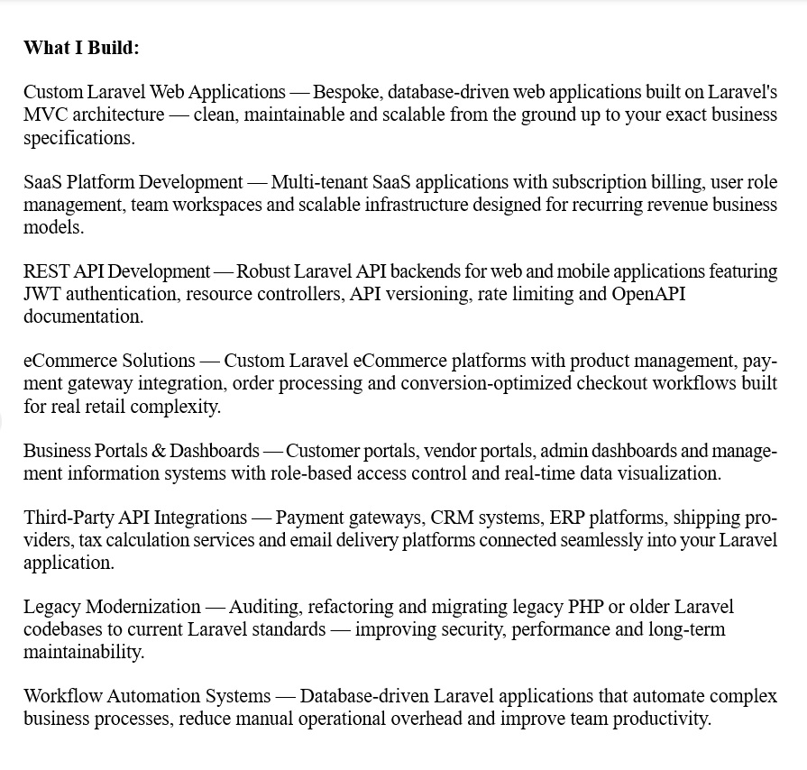 Why Work With Me: 27 years of IT experience across PHP and Laravel development. AI-assisted workflow for faster, cleaner delivery. Clean, documented codebases your team can own and extend confidently. Long-term partnership approach — I build solutions built to last.