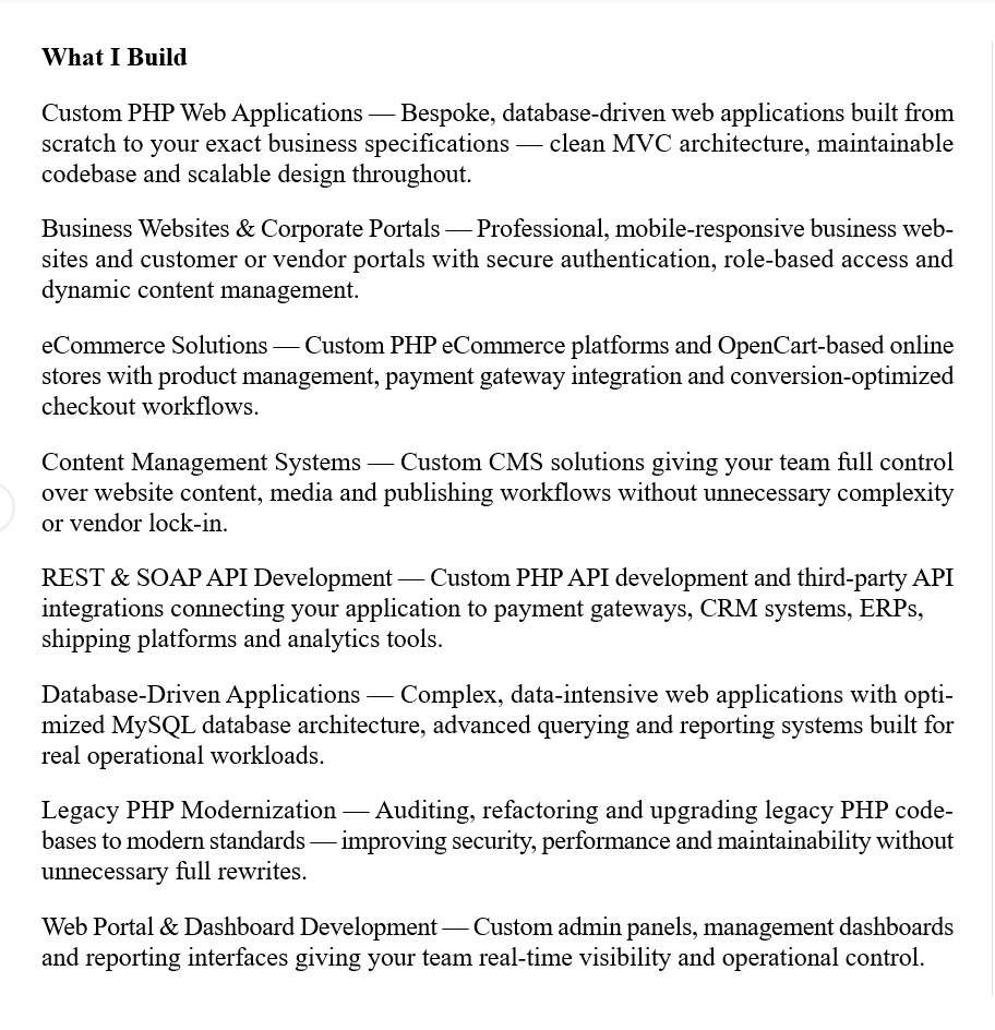 Why Work With Me: 27 years of IT experience across PHP and full-stack web development. AI-assisted workflow for faster, cleaner delivery. Custom-built solutions with no unnecessary dependencies or vendor lock-in. Full documentation so your team owns the codebase confidently.